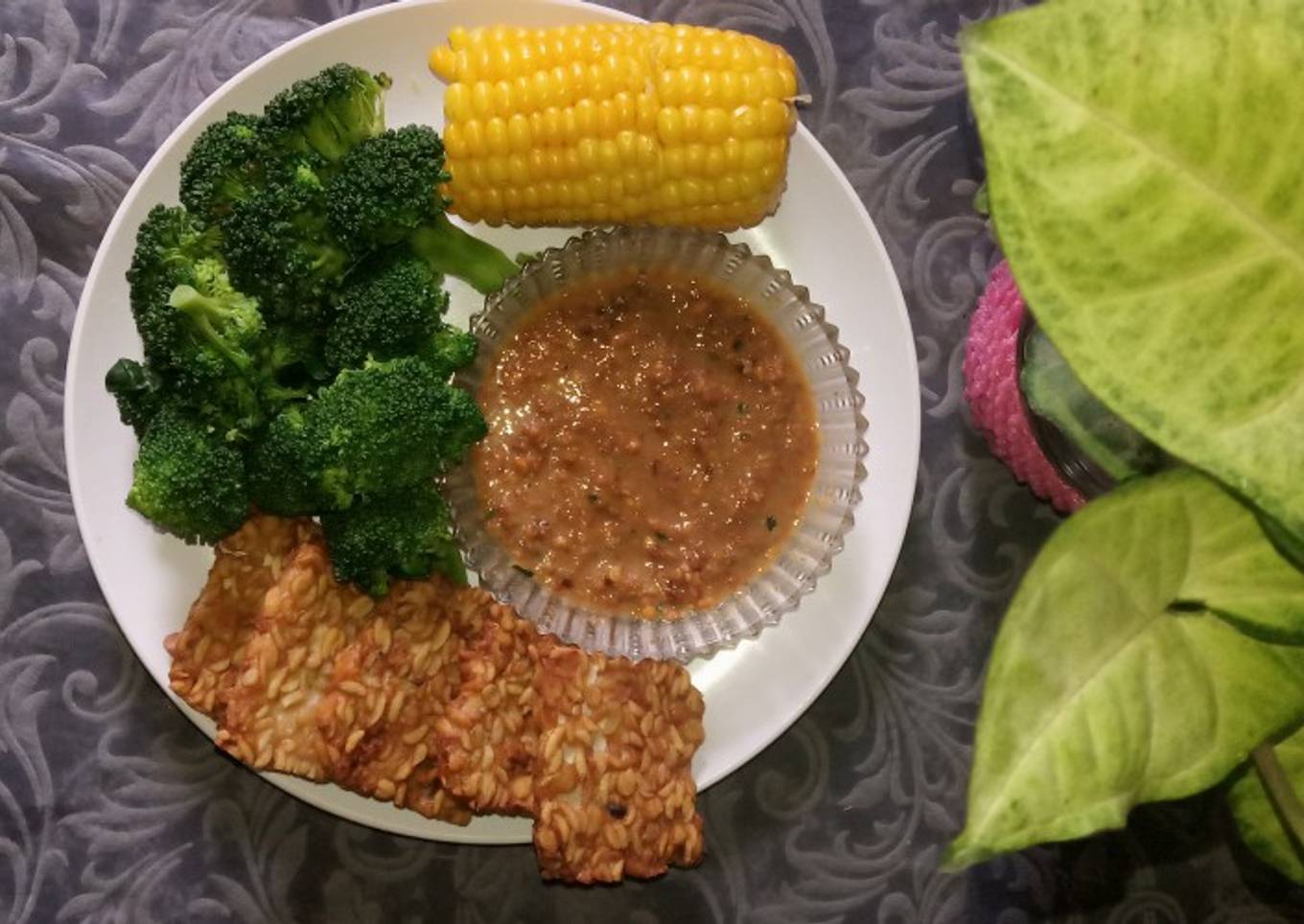 Karena suami suka banget nasi pecel.....tapi beliau skg gg konsumsi nasi....jadinya aQ bikinin sambel pecel aja....utk teman sarapan, aQ rebus sayuran 😊😊 #PejuangGoldenApron3