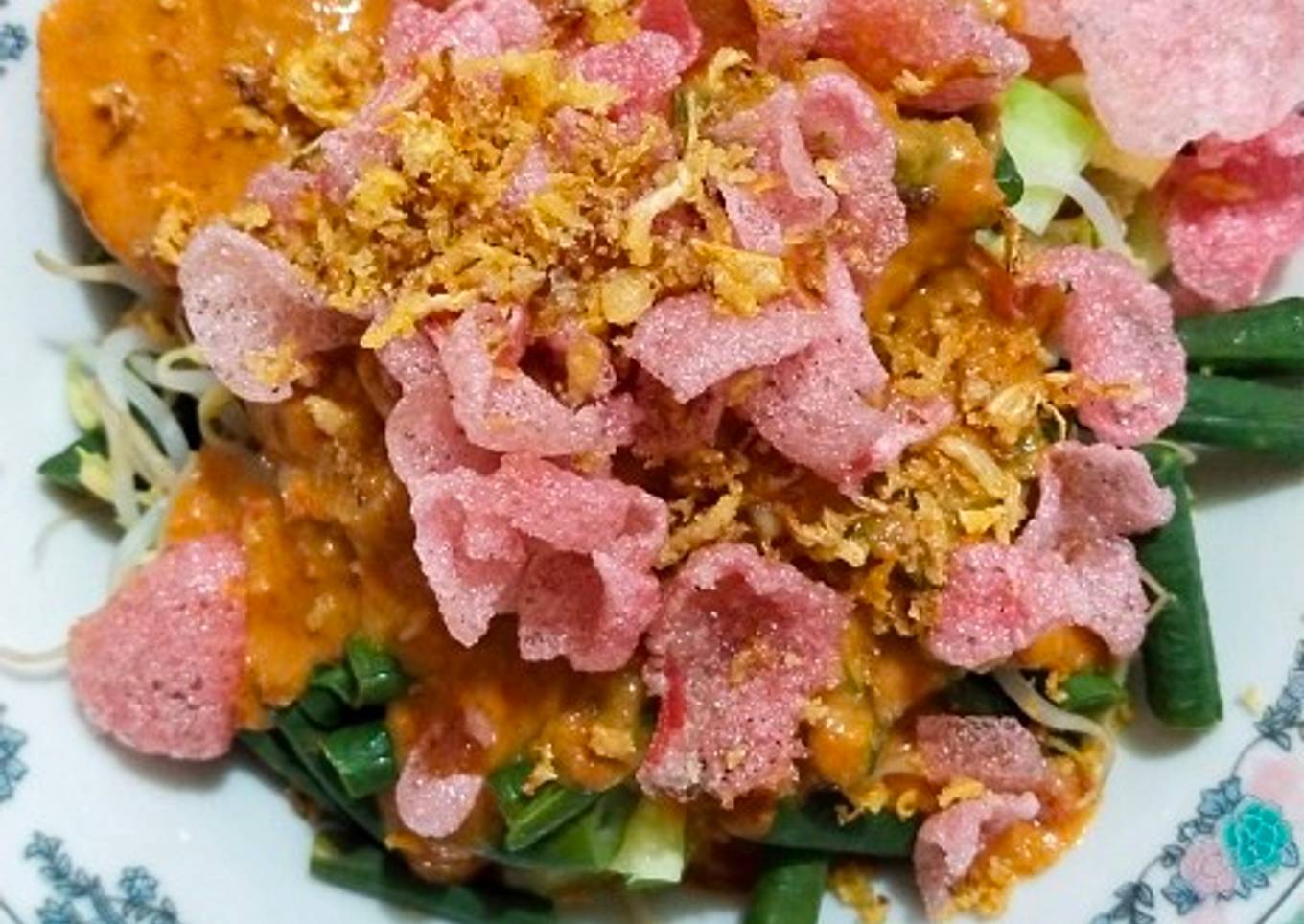 - Siapkan bahan isi,,tata dipiring kentang,tahu,toge,timun, kacang panjang dan telur rebus lalu siramkan kuah kacang,,beri toping kerupuk dan bawang goreng