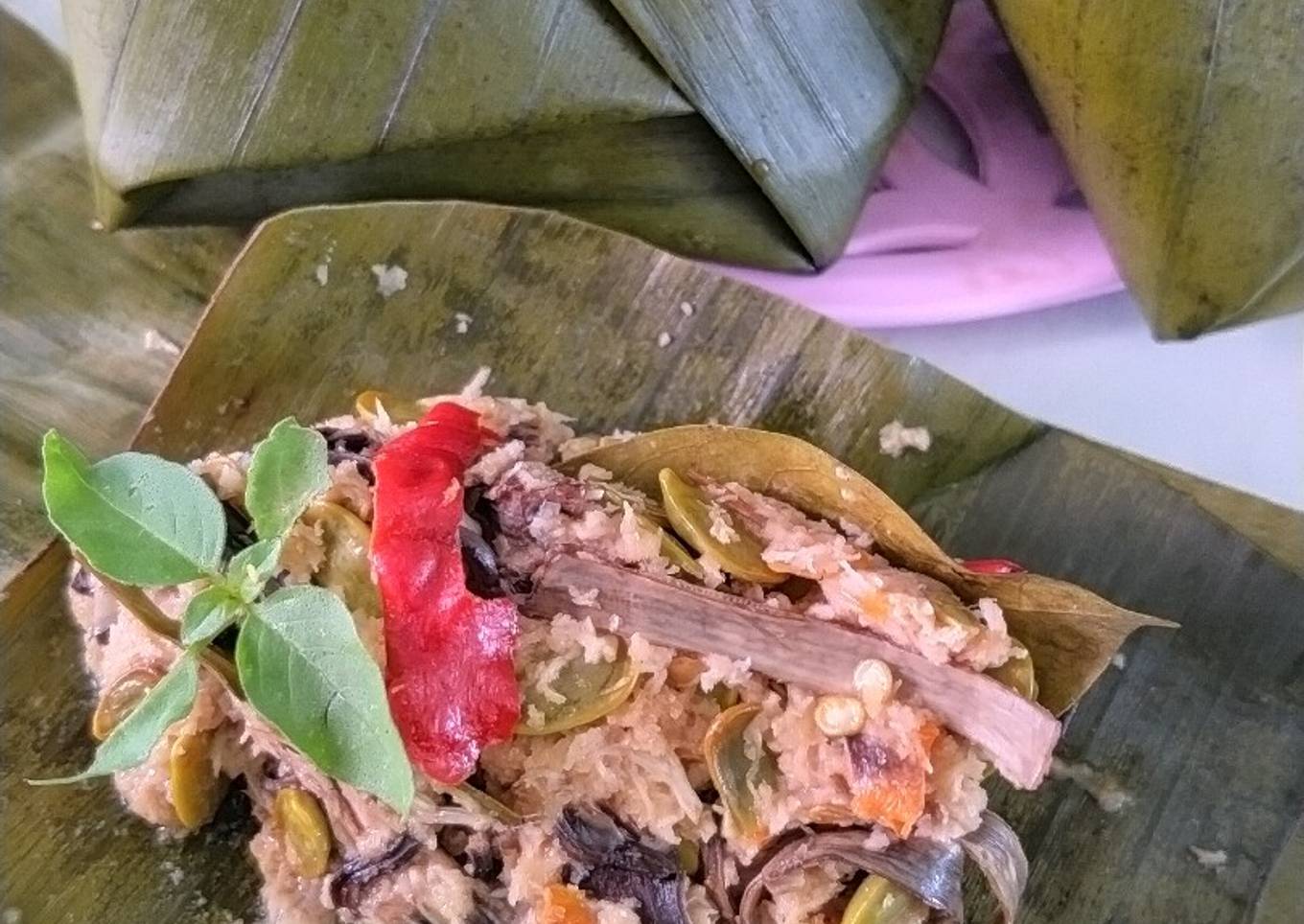 - Ambil sedikit campuran, letakkan di atas daun pisang kemudian tambahkan daun salam. Bungkus dan semat menggunakan lidi.