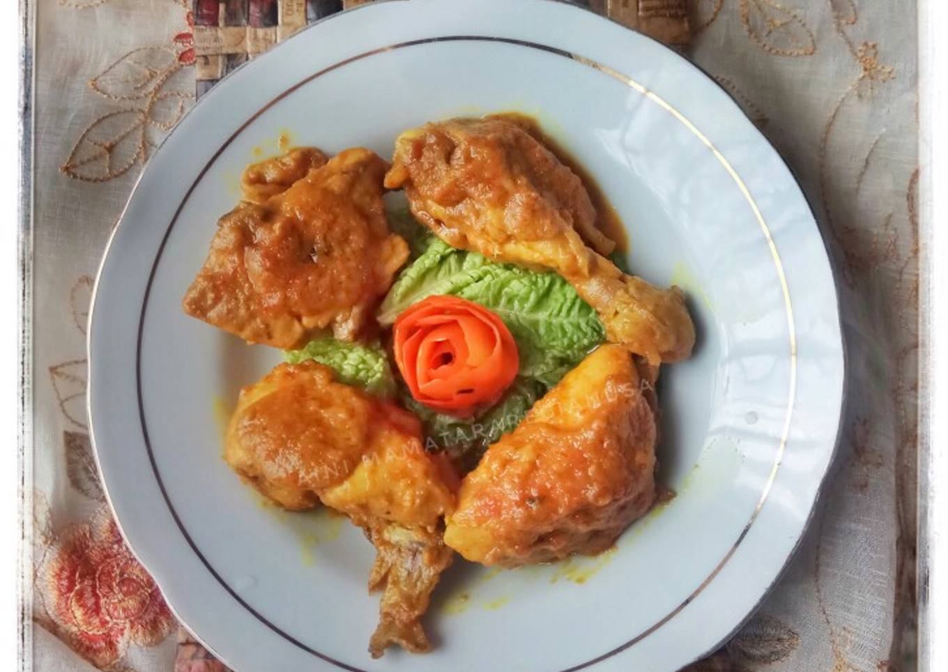 - Tambahkan bumbu tambahan dan air. Biarkan hingga mendidih. Masukkan ayam, garam, gula pasir, santan. Aduk rata. Masak hingga ayam matang merata