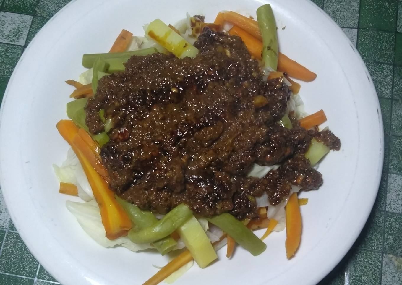 - Setelah semuanya matang,tata rapi di atas piring,taruh sayuran di bagian dasar lalu tuangkan bumbu diatasnya,beri kecap manis diatas bumbu...