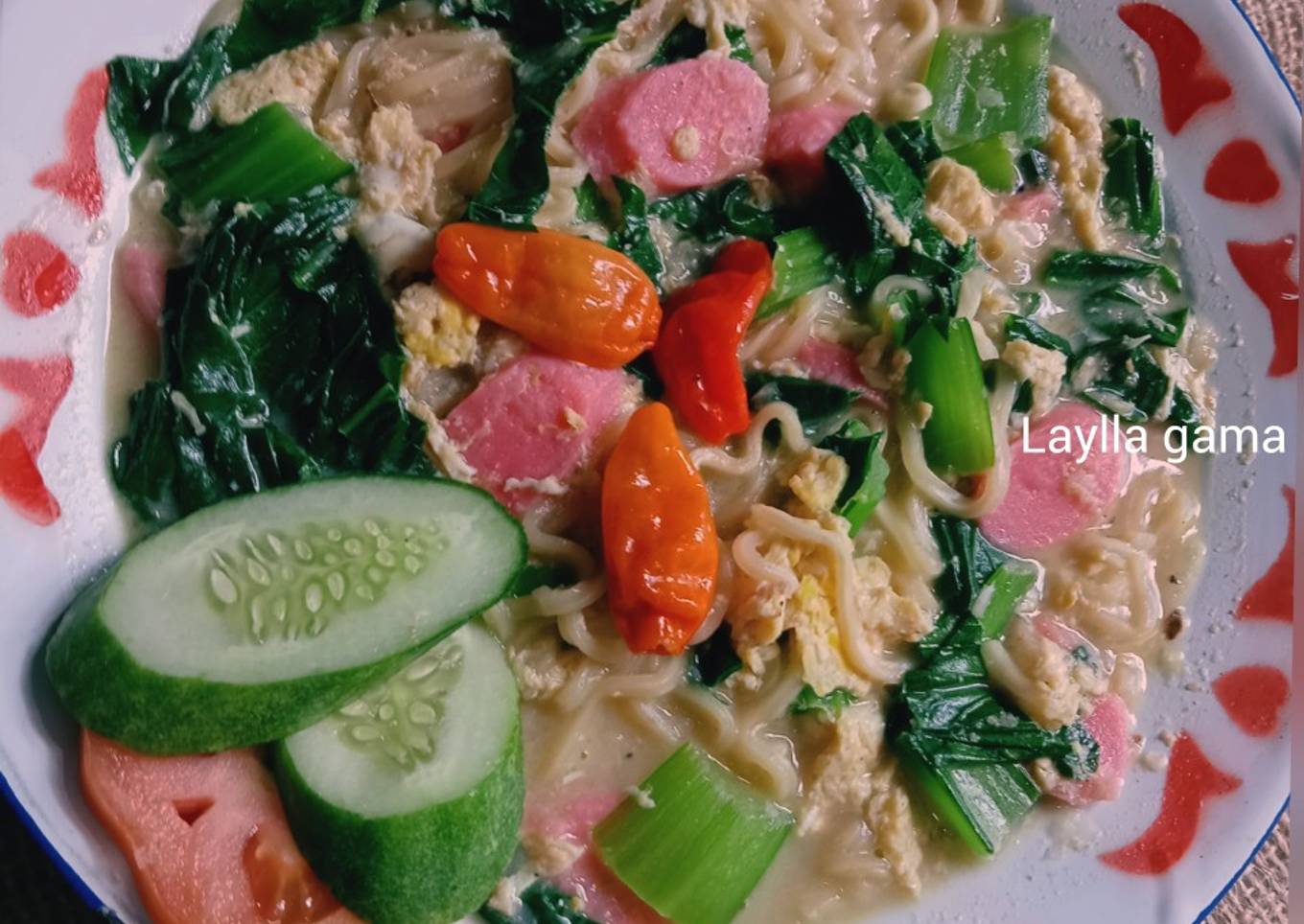- Beri air, biarkan mendidih, masukan telur dan sosis, kemudian mi masak sekitar 2 menit, kemudian beri garam, gula dan kaldu, sesaat sebelum matikan api, masukan pokcoy dan cabe rawit, aduk sebentar lalu matikan api.