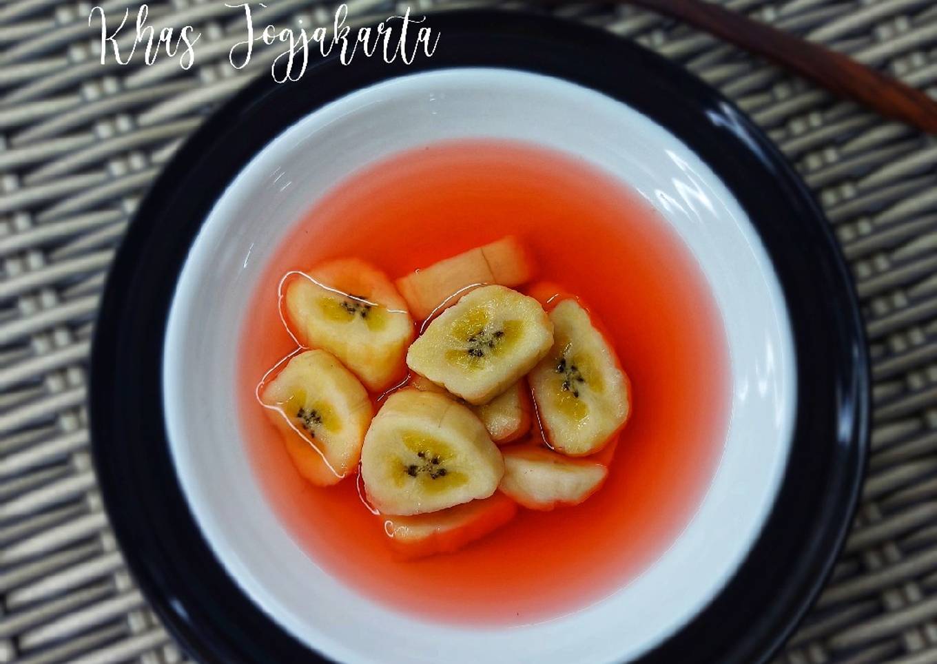 - Potong pisang. Setelah sirup mendidih masukkan potongan pisang. Matikan api. Masukkan perasan jeruk nipis.