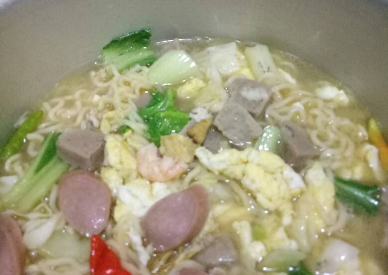- Tumis bumbu halus,sampai harum lalu masukan irisan cabe bila suka pedas, udang,bakso, suwiran ayam,dan sosis aduk rata.selanjutnya tambahan air kaldu panas tambahkan mie dan sayuran aduk sampai mendidih tambahkan gula,garam,merica,kaldu bubuk dikit aja soalnya kaldu blok udah asin.koreksi rasa selanjutnya tambahkan orak arik telurnya aduk sampai tercampur rata dan matang.siap disajikan panas2...hemm maknyuusss....
