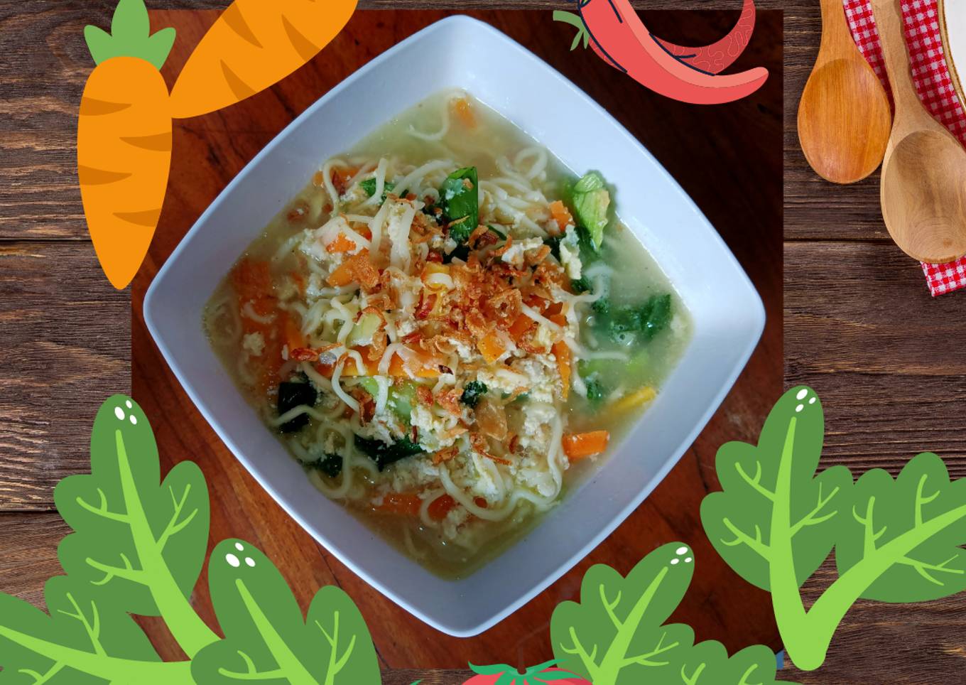 - Sayur : sawi hijau, wortel, bw daun, tomat, (+sesuai selera)