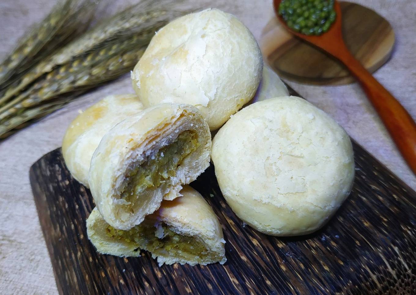- Buat Bahan Isian. Rebus kacang hijau sampai mekar, tiriskan lalu blender. Masak dengan api kecil kacang hijau yg sudah diblender dan semua bahan isian. Masak hingga kalis dan tidak lengket. Dinginkan, lalu bentuk bulat2.