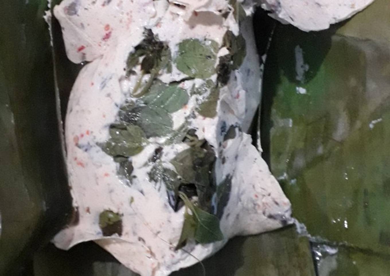 - Daun pisang ditata lalu masukkan daun salam tumpuk daun jeruk diatasnya lau masukkan daun kemangi dan masukkan adonan tahunya Lalu tumpuk dgn daun kemangi Dan bungkus dgn ditusuk pake tusuk gigi biar tertutup rapat