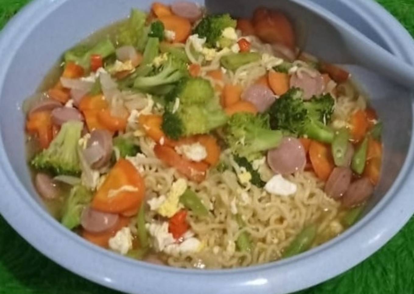 - Masukkan brokoli, wortel, tomat dan cabe rawit aduk" sebentar koreksi rasa jika sudah pas angkat tuang ke dalam mangkuk saji taburi bawang goreng *Mie Godok Sayur* siap dihidangkan
